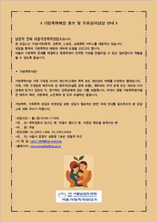 《 가정폭력예방 홍보 및 무료심리상담 안내 》 남성의 전화 서울가정폭력상담소입니다. 본 상담소는 가정(가족)폭력, 성폭력, 스토킹, 교제폭력 서비스를 제공하고 있습니다. 상담을 통하여 가정폭력의 예방과 대처에 도움을 드리고자 합니다. 아울러 가정폭력 문제를 해결하고 평등하면서 안락한 가정을 만들어 갈 수 있는 길라잡이의 역할을 할 수 있도록 돕습니다. 가정폭력이란? 가정폭력이란 가족 구성원 사이의 정신적·신체적 폭력 또는 재산 상의 피해를 수반하는 행위입니다. 이때, 가족 구성원은 배우자와 전 배우자(사실혼 관계 포함), 계부모와 자녀 관계 또는 적모와 서자 관계에 있거나 있었던 자, 동거하는 친족관계에 있는 자를 포함합니다. 따라서 현행 가정폭력방지법은 배우자 학대, 아동학대, 노인학대 등 모두 포괄하는 법입니다. 가정폭력, 가족폭력 상담과 부부상담 관련 상담이 필요하신 분은 아래 안내를 참조하시어 본 상담소에 전화 주시기 바랍니다. *상담시간 : 월~금(10:00~17:00) *대 상: 부부갈등이 있는 분, 마음이 힘드신 분, 자존감 향상을 원하시는 분 *비 용: 무료 *문의전화: 02.2653.1366, 02.2652.0456 *위 치: 서울시 중랑구 상봉동 7호선 전철역 부근 *이 메 일: sdvc1366@hanmail.net *홈페이지: www.manhotline.or.kr